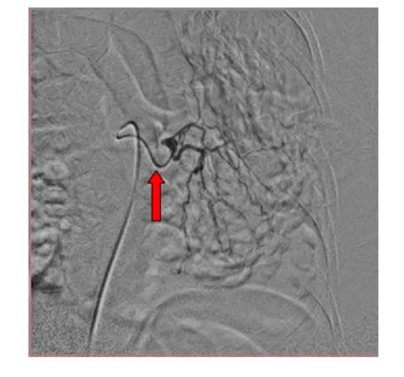 Common bronchial-intercostal trunk. Both the right bronchial artery and superior intercostal artery arise from a common trunk. The bronchial artery (straight red arrow) follows the course of the mainstem bronchus, whereas the intercostal artery follows the undersurface of the rib (curved arrow). Abnormal vessels & blush (Straight white arrow).